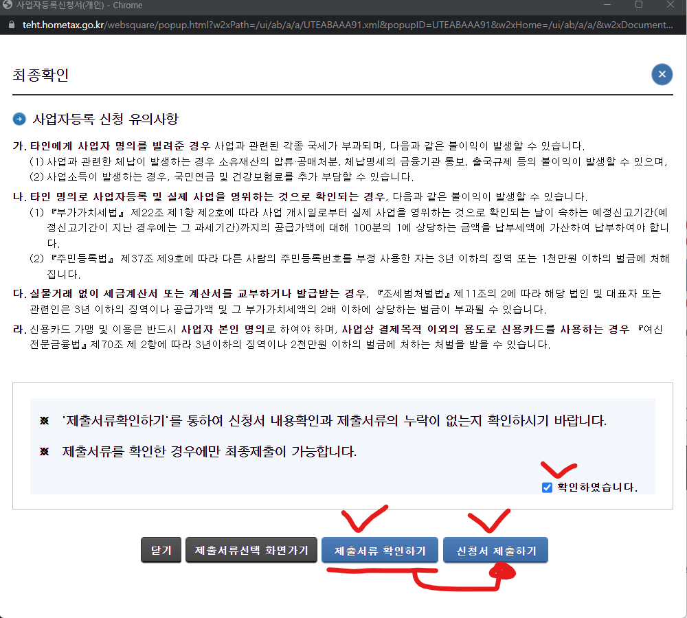 * 제출서류 확인하기를 누르신후, 신청서 제출하기 버튼을 누르시면 완료가 됩니다.