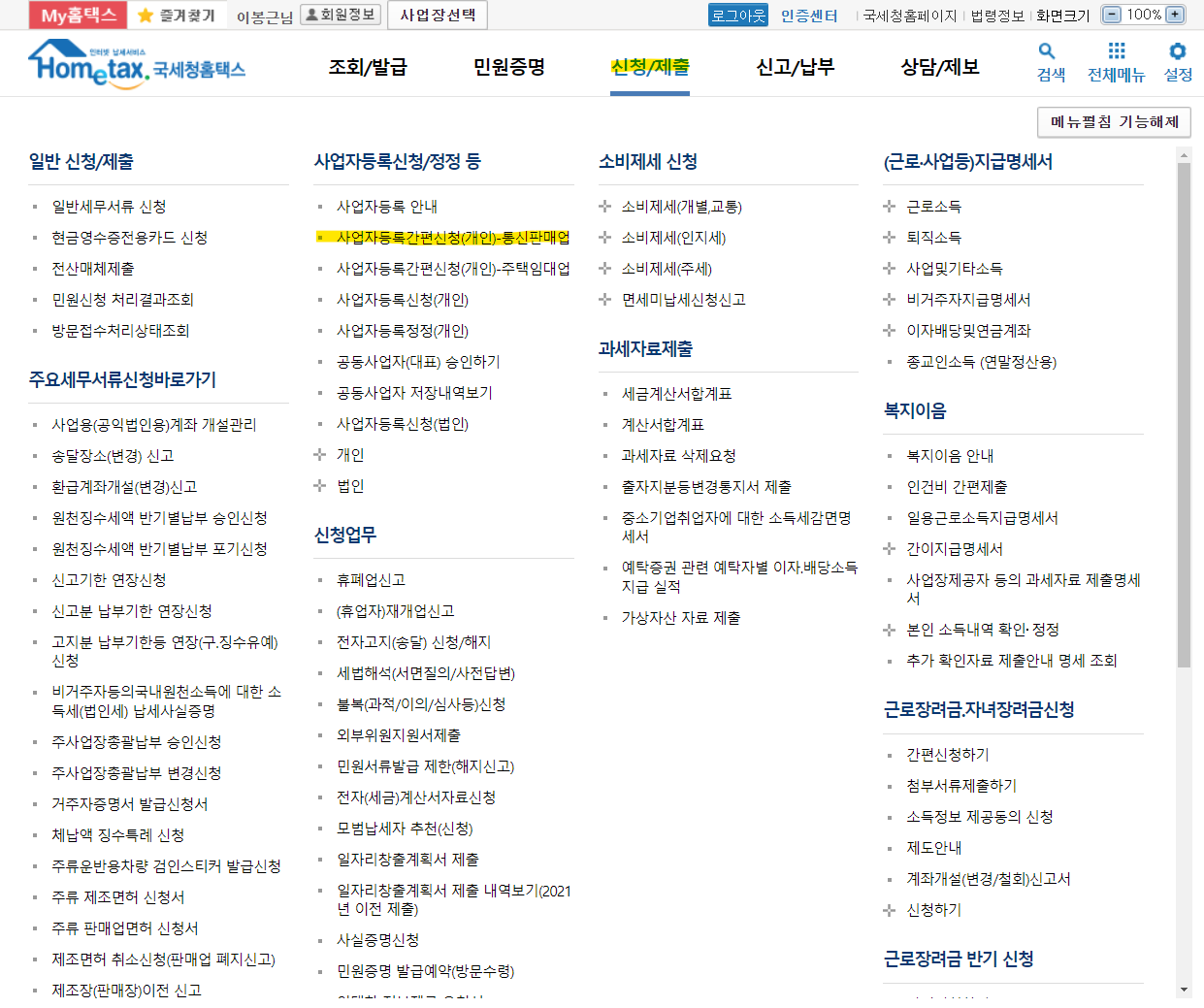 2. [신청/제출]에 마우스를 올리면 사업자등록간편신청(개인)-통신판매업 클릭