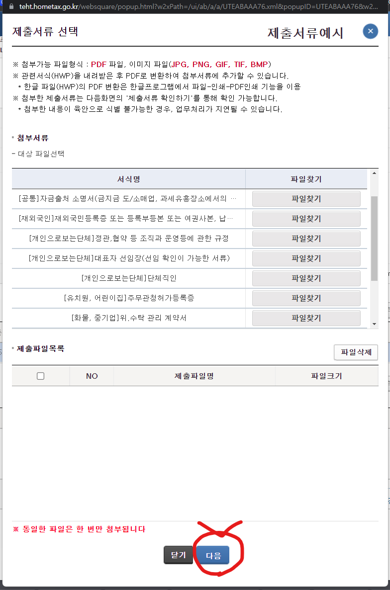 보통 처음 시작하시는 일반분들(집에서 시작하시는 분)은 서류에 해당하는 것이 없기에 다음을 눌러줍니다.