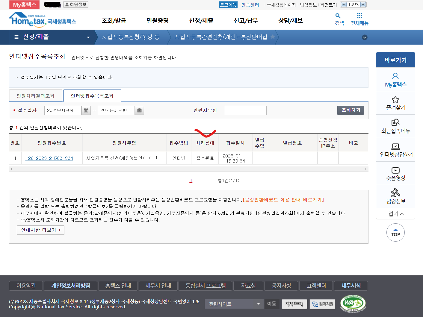 이렇게 간단하게 위탁판매, 통신판매를 위한 사업자등록신청을 완료하였습니다.