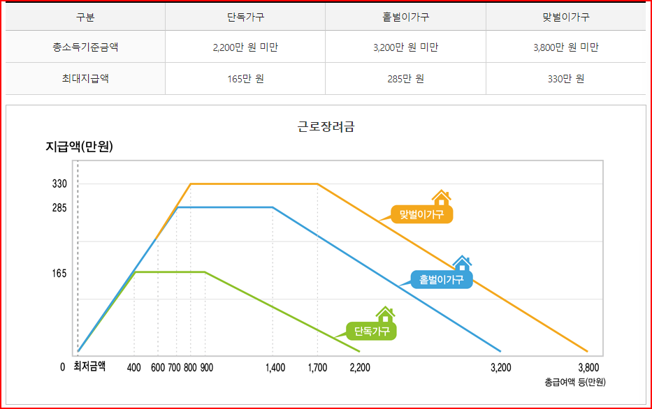 근로장려금은 가구원 구성에 따라 정한 부부합산 총급여액 등을 기준으로 지급액을 산정합니다.