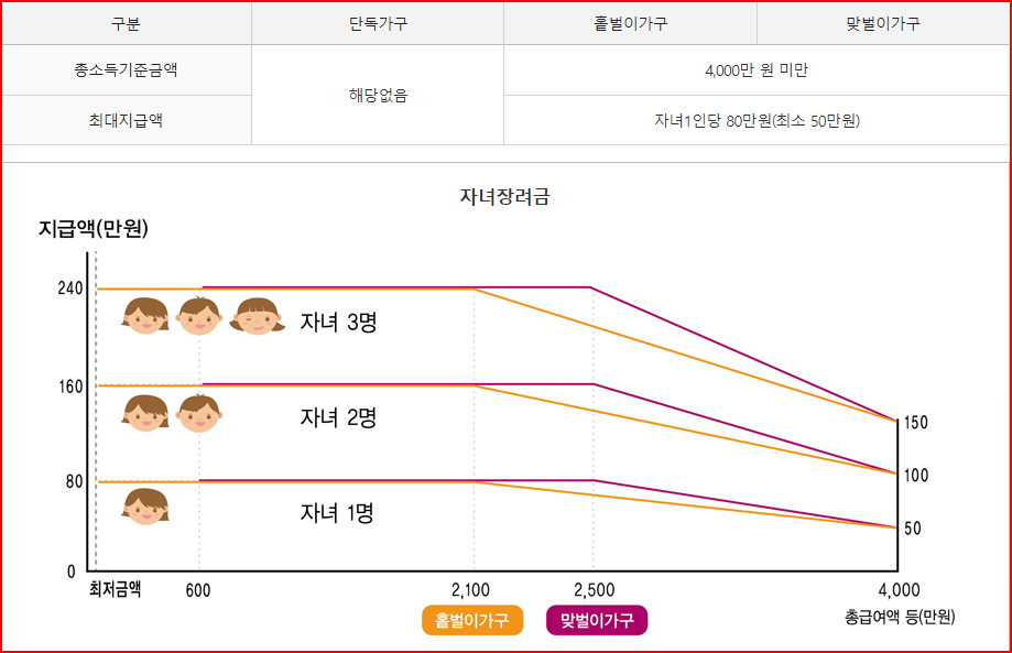 ㆍ 홑벌이 가구 부양자녀 1명 당 최대 80만 원