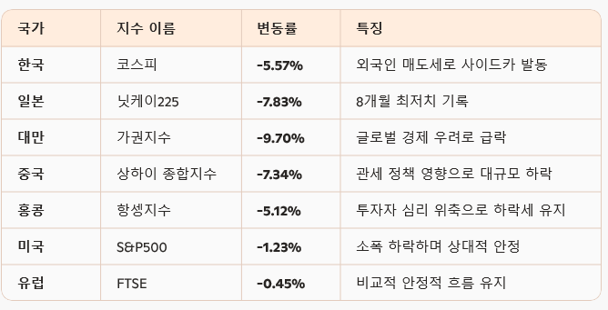 코스피는 5.57% 폭락하며 2,328.20으로 마감했고, 이는 투자자들에게 심각한 경제적 불안감을 안겨주었습니다. 외국인 투자자들이 약 3조 원의 주식을 매도하며 대규모 자본이 빠져나갔으며, 프로그램 매매를 제한하기 위한 사이드카가 발동되었습니다. 또한, 원/달러 환율은 하루 만에 33.7원이 상승해 1,467.8원을 기록하며 외환시장까지 큰 변동성이 발생했습니다. 국내뿐만 아니라 글로벌 증시도 전반적으로 하락세를 보였으며, 일본, 대만, 중국과 같은 아시아 주요 시장들이 큰 폭으로 하락했습니다.