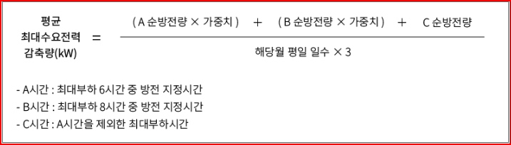 · AMI 부설고객에 대한 평균 최대수요전력 감축량은 지정시간 순방전량에 대해 가중치를 적용하여 다음과 같이 산정한다. 이때 순방전량은 해당월 평일 지정시간대 방전량 합계에서 해당월 평일 지정시간대 충전량 합계를 차감한 방전량을 말한다.