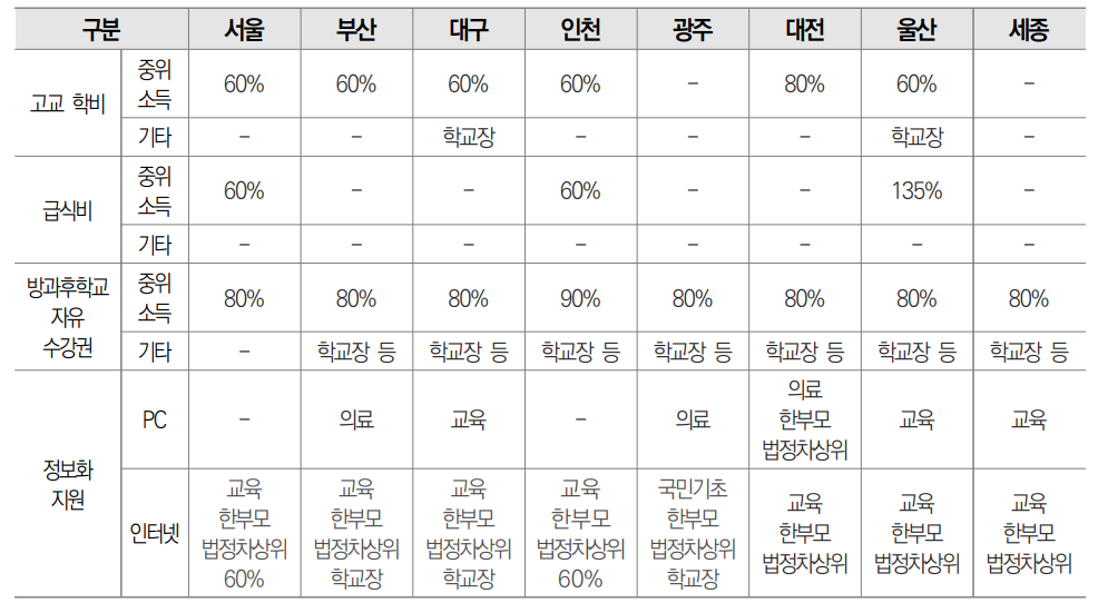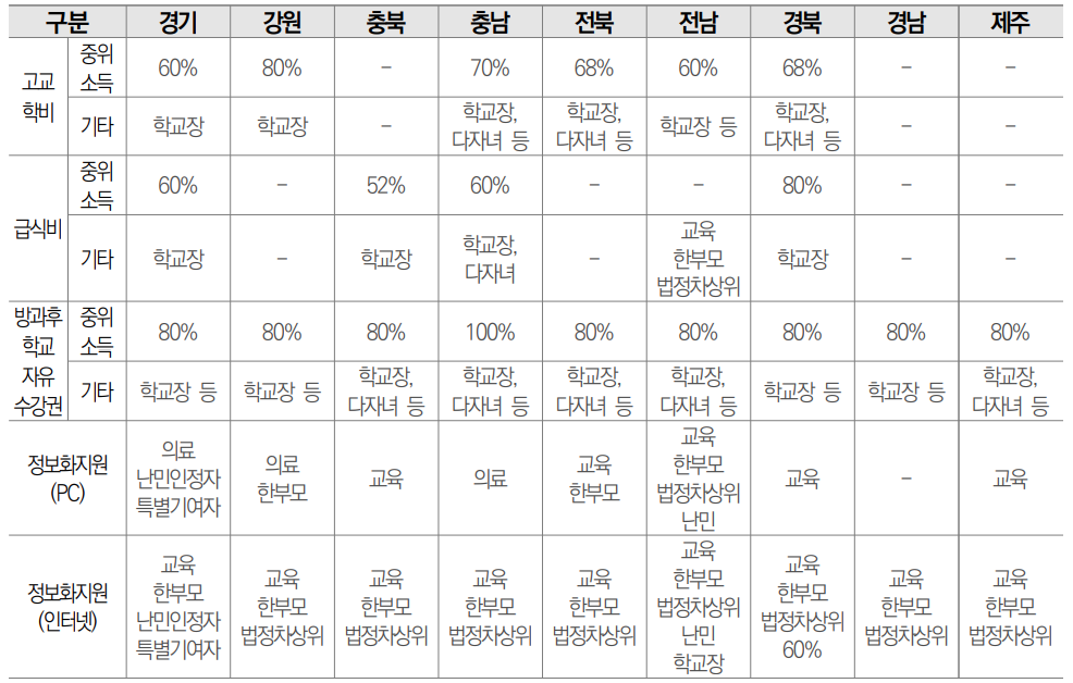 - 고교 학비, 급식비, 방과후학교 자유수강권, 교육정보화 지원(PC, 인터넷 통신비)