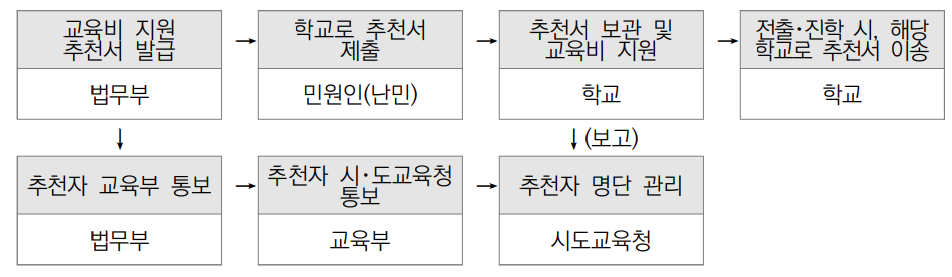 - 지원 대상 : 법무부장관이 교육비 지원을 추천한 난민인정자, 아프간 등 국적의 특별기여자 또는 그 자녀